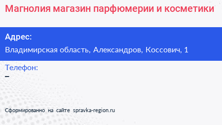 Магнолия, магазин парфюмерии и косметики по адресу Владимирская область, Александров, Коссович, 1 в дальнейшем Организация, размещена в следующих категориях: