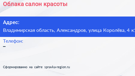 Облака, салон красоты по адресу Владимирская область, Александров, улица Королёва, 4 к1 в дальнейшем Организация, размещена в следующих категориях: