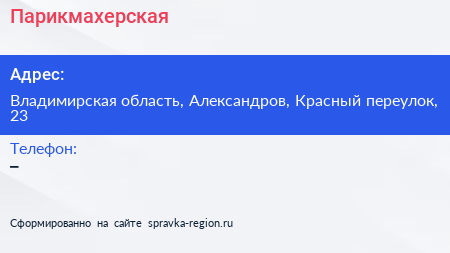 Парикмахерская по адресу Владимирская область, Александров, Красный переулок, 23 в дальнейшем Организация, размещена в следующих категориях: