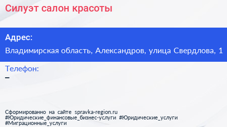 Силуэт, салон красоты по адресу Владимирская область, Александров, улица Свердлова, 1 в дальнейшем Организация, размещена в следующих категориях: