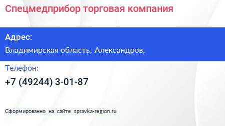 Спецмедприбор, торговая компания по адресу Владимирская область, Александров, в дальнейшем Организация, размещена в следующих категориях: