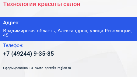 Технологии красоты, салон по адресу Владимирская область, Александров, улица Революции, 45 в дальнейшем Организация, размещена в следующих категориях: