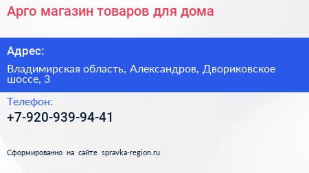 Арго, магазин товаров для дома по адресу Владимирская область, Александров, Двориковское шоссе, 3 в дальнейшем Организация, размещена в следующих категориях: