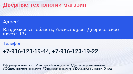 Дверные технологии, магазин по адресу Владимирская область, Александров, Двориковское шоссе, 13а в дальнейшем Организация, размещена в следующих категориях: