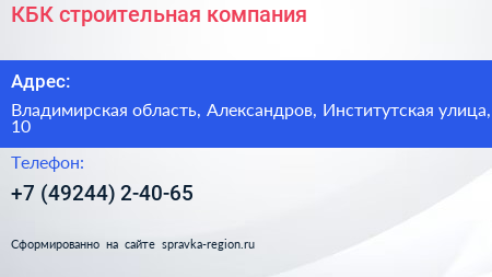 КБК, строительная компания по адресу Владимирская область, Александров, Институтская улица, 10 в дальнейшем Организация, размещена в следующих категориях: