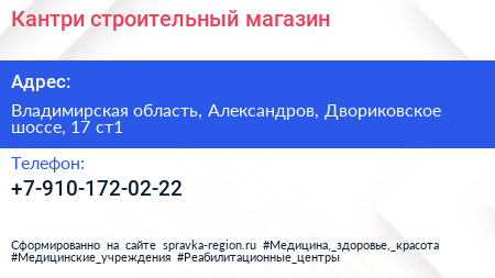 Кантри, строительный магазин по адресу Владимирская область, Александров, Двориковское шоссе, 17 ст1 в дальнейшем Организация, размещена в следующих категориях: