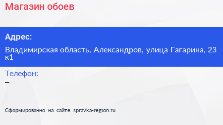 Магазин обоев по адресу Владимирская область, Александров, улица Гагарина, 23 к1 в дальнейшем Организация, размещена в следующих категориях: