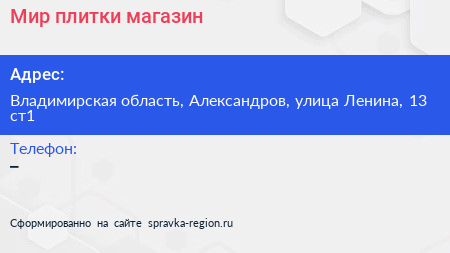 Мир плитки, магазин по адресу Владимирская область, Александров, улица Ленина, 13 ст1 в дальнейшем Организация, размещена в следующих категориях: