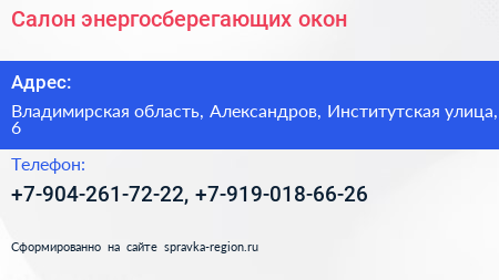 Салон энергосберегающих окон по адресу Владимирская область, Александров, Институтская улица, 6 в дальнейшем Организация, размещена в следующих категориях: