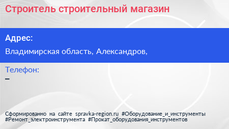 Строитель, строительный магазин по адресу Владимирская область, Александров, в дальнейшем Организация, размещена в следующих категориях:
