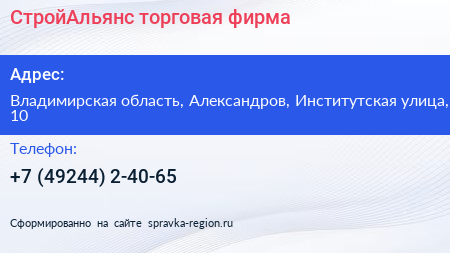 СтройАльянс, торговая фирма по адресу Владимирская область, Александров, Институтская улица, 10 в дальнейшем Организация, размещена в следующих категориях: