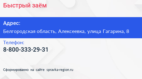 Быстрый заём по адресу Белгородская область, Алексеевка, улица Гагарина, 8 в дальнейшем Организация, размещена в следующих категориях:
