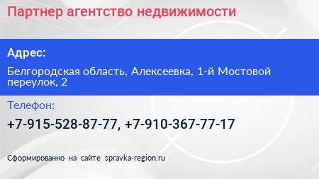 Партнер, агентство недвижимости по адресу Белгородская область, Алексеевка, 1-й Мостовой переулок, 2 в дальнейшем Организация, размещена в следующих категориях: