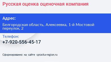 Русская оценка, оценочная компания по адресу Белгородская область, Алексеевка, 1-й Мостовой переулок, 2 в дальнейшем Организация, размещена в следующих категориях: