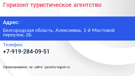 Горизонт, туристическое агентство по адресу Белгородская область, Алексеевка, 1-й Мостовой переулок, 2Б в дальнейшем Организация, размещена в следующих категориях: