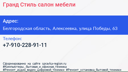 Гранд-Стиль, салон мебели по адресу Белгородская область, Алексеевка, улица Победы, 63 в дальнейшем Организация, размещена в следующих категориях: