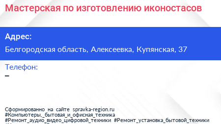 Мастерская по изготовлению иконостасов по адресу Белгородская область, Алексеевка, Купянская, 37 в дальнейшем Организация, размещена в следующих категориях: