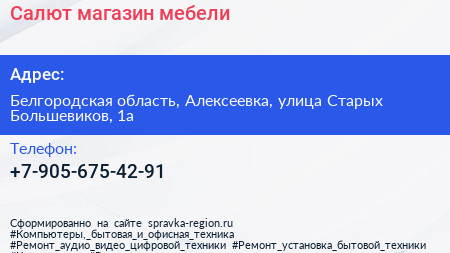 Салют, магазин мебели по адресу Белгородская область, Алексеевка, улица Старых Большевиков, 1а в дальнейшем Организация, размещена в следующих категориях: