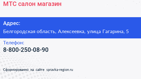 МТС, салон-магазин по адресу Белгородская область, Алексеевка, улица Гагарина, 5 в дальнейшем Организация, размещена в следующих категориях: