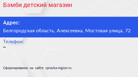 Бэмби, детский магазин по адресу Белгородская область, Алексеевка, Мостовая улица, 72 в дальнейшем Организация, размещена в следующих категориях: