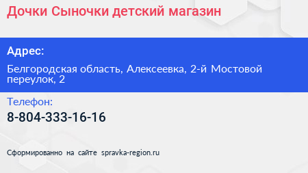 Дочки-Сыночки, детский магазин по адресу Белгородская область, Алексеевка, 2-й Мостовой переулок, 2 в дальнейшем Организация, размещена в следующих категориях: