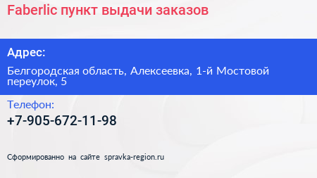 Faberlic, пункт выдачи заказов по адресу Белгородская область, Алексеевка, 1-й Мостовой переулок, 5 в дальнейшем Организация, размещена в следующих категориях: