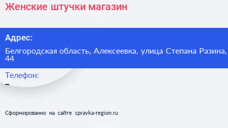 Женские штучки, магазин по адресу Белгородская область, Алексеевка, улица Степана Разина, 44 в дальнейшем Организация, размещена в следующих категориях:
