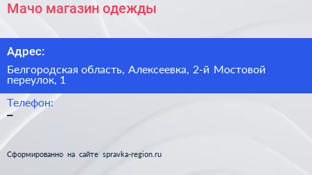 Мачо, магазин одежды по адресу Белгородская область, Алексеевка, 2-й Мостовой переулок, 1 в дальнейшем Организация, размещена в следующих категориях: