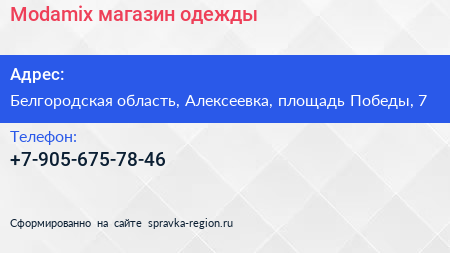 Modamix, магазин одежды по адресу Белгородская область, Алексеевка, площадь Победы, 7 в дальнейшем Организация, размещена в следующих категориях: