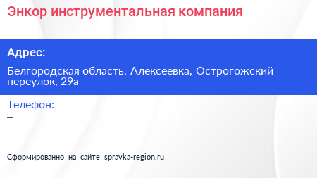 Энкор, инструментальная компания по адресу Белгородская область, Алексеевка, Острогожский переулок, 29а в дальнейшем Организация, размещена в следующих категориях: