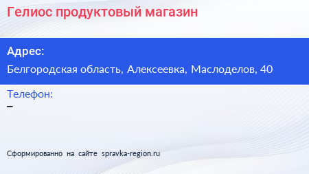 Гелиос, продуктовый магазин по адресу Белгородская область, Алексеевка, Маслоделов, 40 в дальнейшем Организация, размещена в следующих категориях: