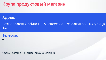 Крупа, продуктовый магазин по адресу Белгородская область, Алексеевка, Революционная улица, 32г в дальнейшем Организация, размещена в следующих категориях: