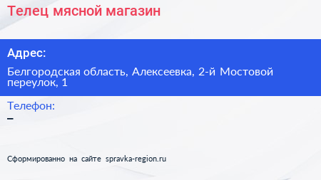 Телец, мясной магазин по адресу Белгородская область, Алексеевка, 2-й Мостовой переулок, 1 в дальнейшем Организация, размещена в следующих категориях:
