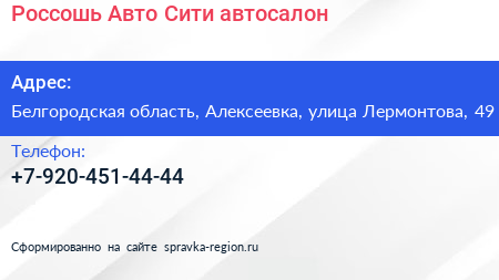 Россошь Авто Сити, автосалон по адресу Белгородская область, Алексеевка, улица Лермонтова, 49 в дальнейшем Организация, размещена в следующих категориях:
