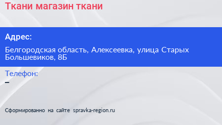 Ткани, магазин ткани по адресу Белгородская область, Алексеевка, улица Старых Большевиков, 8Б в дальнейшем Организация, размещена в следующих категориях: