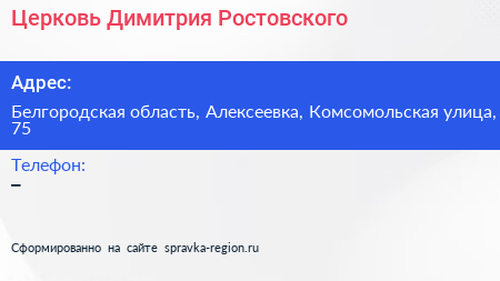 Церковь Димитрия Ростовского по адресу Белгородская область, Алексеевка, Комсомольская улица, 75 в дальнейшем Организация, размещена в следующих категориях: