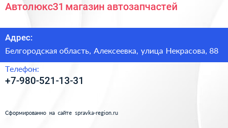 Автолюкс31, магазин автозапчастей по адресу Белгородская область, Алексеевка, улица Некрасова, 88 в дальнейшем Организация, размещена в следующих категориях: