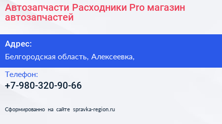 Автозапчасти Расходники Pro, магазин автозапчастей по адресу Белгородская область, Алексеевка, в дальнейшем Организация, размещена в следующих категориях: