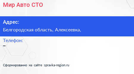Мир Авто, СТО по адресу Белгородская область, Алексеевка, в дальнейшем Организация, размещена в следующих категориях: