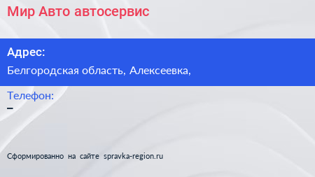 Мир Авто, автосервис по адресу Белгородская область, Алексеевка, в дальнейшем Организация, размещена в следующих категориях: