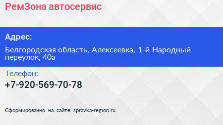РемЗона, автосервис по адресу Белгородская область, Алексеевка, 1-й Народный переулок, 40а в дальнейшем Организация, размещена в следующих категориях: