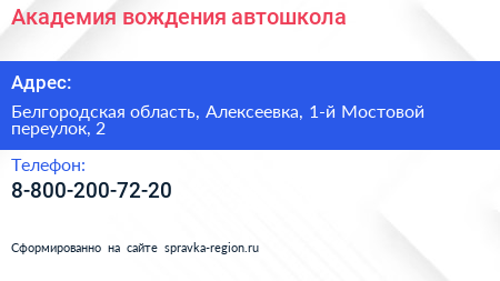 Академия вождения, автошкола по адресу Белгородская область, Алексеевка, 1-й Мостовой переулок, 2 в дальнейшем Организация, размещена в следующих категориях: