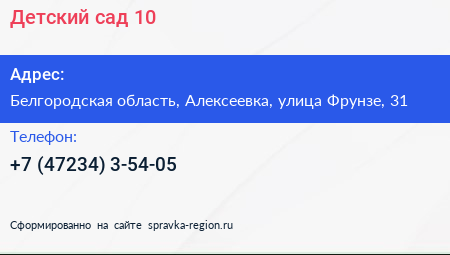 Детский сад №10 по адресу Белгородская область, Алексеевка, улица Фрунзе, 31 в дальнейшем Организация, размещена в следующих категориях: