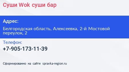 Суши Wok, суши-бар по адресу Белгородская область, Алексеевка, 2-й Мостовой переулок, 2 в дальнейшем Организация, размещена в следующих категориях: