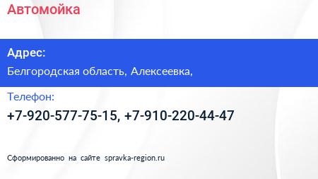 Автомойка по адресу Белгородская область, Алексеевка, в дальнейшем Организация, размещена в следующих категориях: