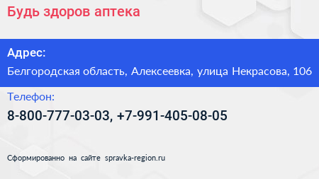 Будь здоров!, аптека по адресу Белгородская область, Алексеевка, улица Некрасова, 106 в дальнейшем Организация, размещена в следующих категориях: