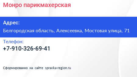 Монро, парикмахерская по адресу Белгородская область, Алексеевка, Мостовая улица, 71 в дальнейшем Организация, размещена в следующих категориях: