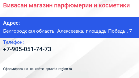 Вивасан, магазин парфюмерии и косметики по адресу Белгородская область, Алексеевка, площадь Победы, 7 в дальнейшем Организация, размещена в следующих категориях: