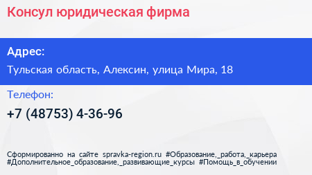 Консул, юридическая фирма по адресу Тульская область, Алексин, улица Мира, 18 в дальнейшем Организация, размещена в следующих категориях: