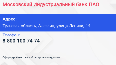 Московский Индустриальный банк, ПАО по адресу Тульская область, Алексин, улица Ленина, 14 в дальнейшем Организация, размещена в следующих категориях: